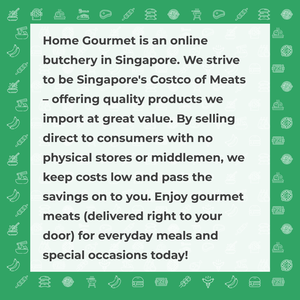 Home Gourmet is an online butchery in Singapore. We strive to be Singapore's Costco of Meats – offering quality products we import at great value. By selling direct to consumers with no physical stores or middlemen, we keep costs low and pass the savings on to you. Enjoy gourmet meats (delivered right to your door) for everyday meals and special occasions today!